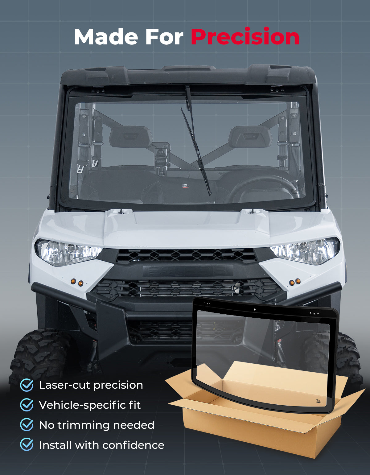The Polaris Ranger 1000 Glass Windshield offers scratch-resistant laminated glass for clear, glare-free visibility in any terrain. With a manual wiper covering over 90% of the surface, it keeps your view clear in mud, rain, or snow. Easy to install and seamlessly compatible with your roof, it provides durable protection against wind, dust, and weather for a smoother ride.