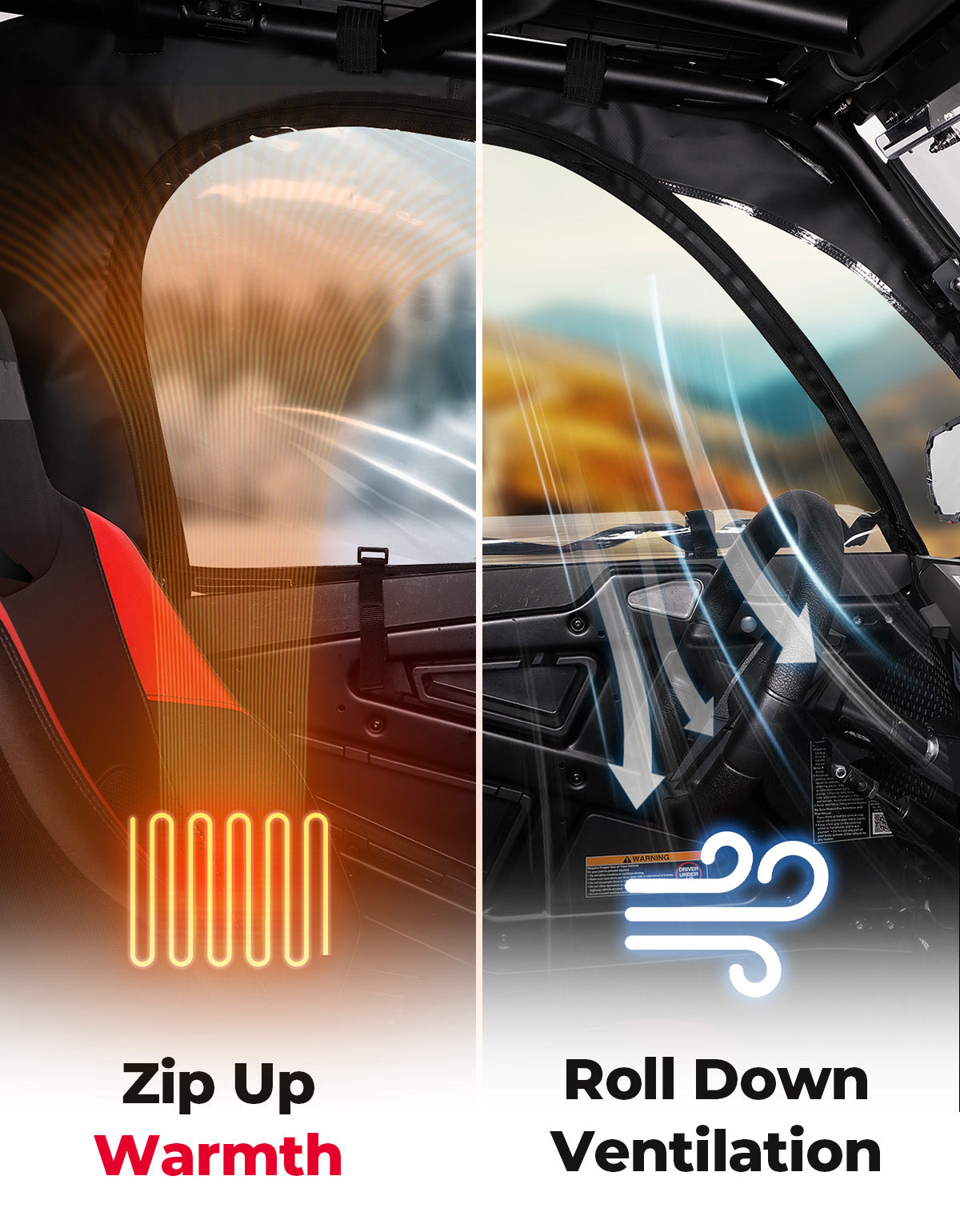 KEMIMOTO soft upper door enclosure for 2024/2025 Polaris RZR XP 1000 features roll-up windows, mirror/windshield compatibility, enhanced zippers, and weatherproof materials. Easy 2-step installation keeps you warm, dry, and trail-ready year-round.
