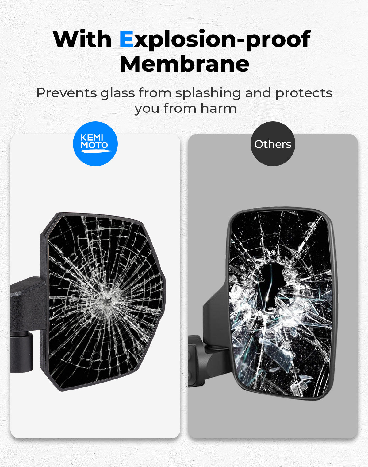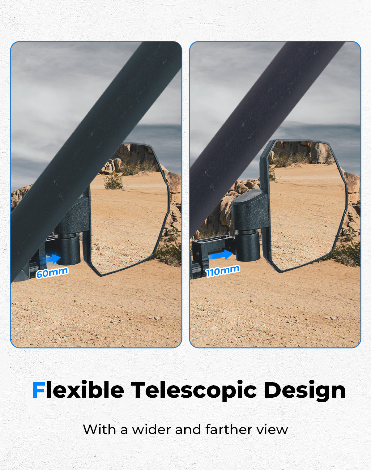 Stay safe and confident on every trail with KEMIMOTO telescopic UTV side mirrors. The adjustable design lets you extend outward 2.4–4.3 inches and fine-tune the view with triple-angle flexibility—telescopic, 360°, and 250° rotation—for a clear, wide field of vision. Crafted from durable aluminum with a blast-resistant glass film, these mirrors stand strong against rocks and debris. The breakaway function allows the mirrors to fold inward on impact, preventing damage when brushing past trees or obstacles, ensuring long-lasting reliability through every ride.