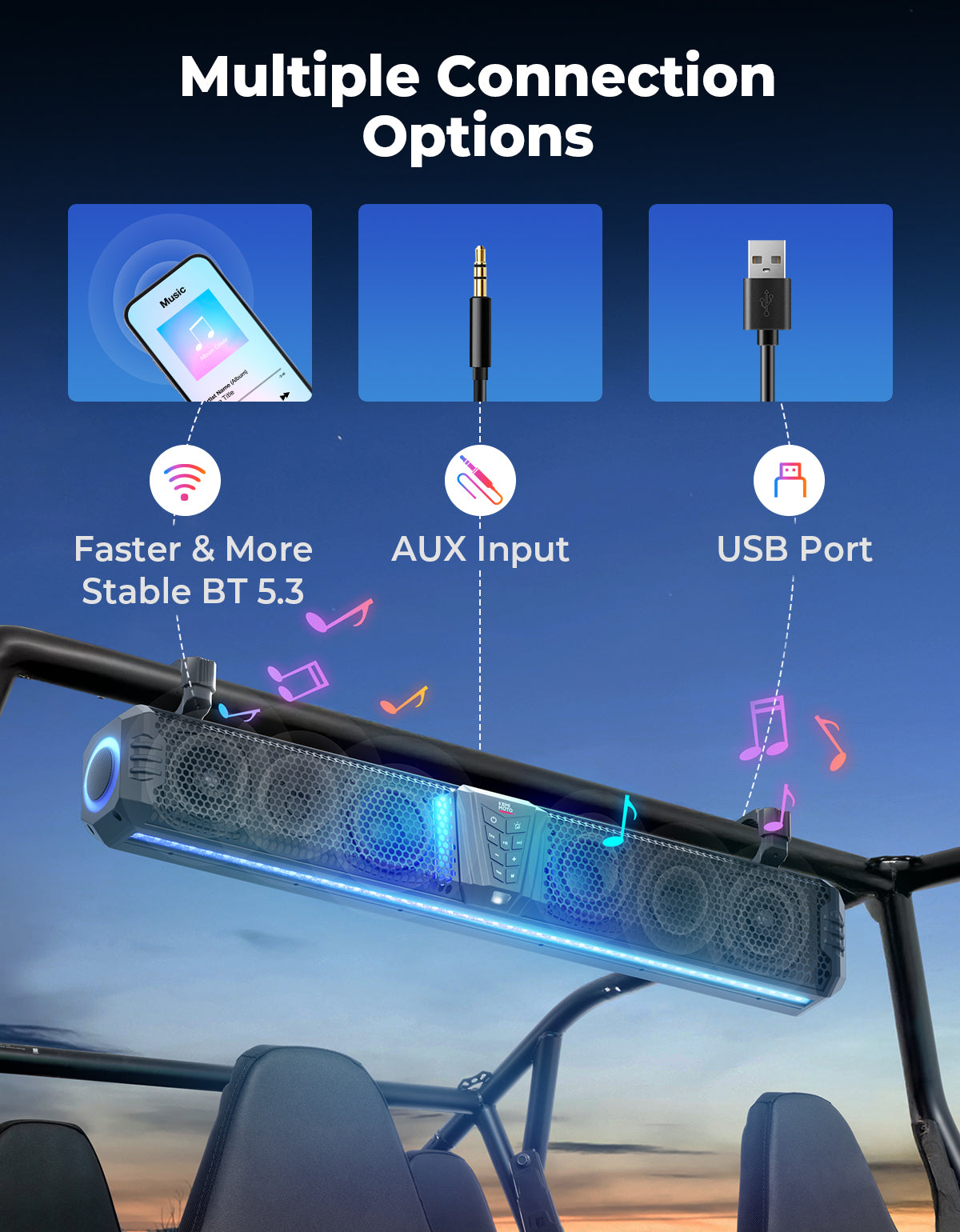 Made of IP66 Marine Grade weatherproof aluminum alloy case, this sxs sound bar is born for outdoor use. It can work in high humidity, low temperature, and dusty environments, withstanding extreme weather conditions from -20℃ to 85℃. Plus, the upgraded built-in protection design prevents the speaker bar from breaking in extreme weather and power surges during vehicle starts. Elevate your off-road experience with this dependable partner.
