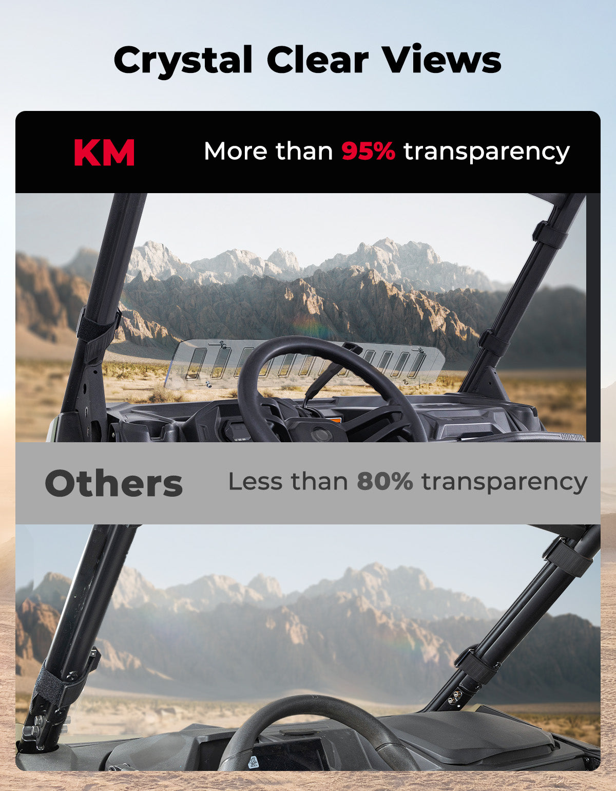 Protect yourself and your passenger with the Can Am Defender front windshield. With its 12 sliding vents, you can stay cool in the summer and defog or defrost in the winter for a clear view. Made of scratch-resistant polycarbonate, this windshield is 250 times stronger than glass and 25 times stronger than acrylic. It's easy to install with no drilling or tools required. Get your Can Am Defender front windshield today and enjoy a comfortable and safe ride.