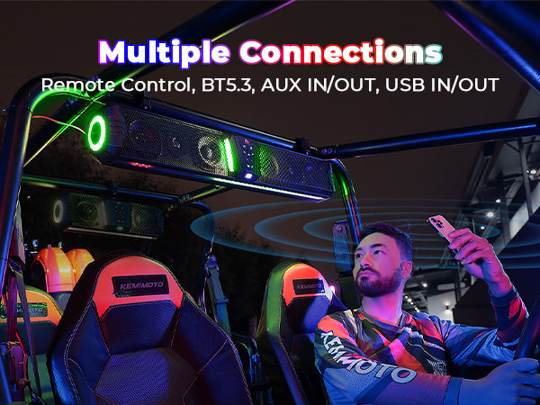 Enjoy easy pairing and reconnection with the BT5.3 connection, compatible with smartphones, MP3, tablets, computers, and other devices. The KEMIMOTO utv sound bar also features USB in/out ports for power supply and connection, as well as Party Mode to connect 2 speakers simultaneously for wider music coverage and a vibrant atmosphere. The Daisy Chain lets you connect as many soundbars as you wish for a huge party.