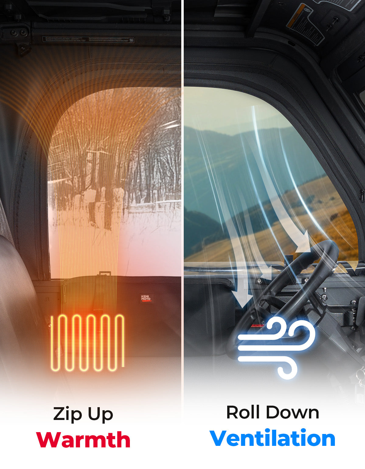 Upgrade your ride with Can-Am Defender Max Soft Doors, engineered for all-season comfort and protection. These full doors for Can-Am Defender Max feature a 98% seal design that keeps cold air out and helps maintain a cabin temperature up to 18°F warmer—ideal for cold-weather rides or long workdays. Built with a triple-layer wind barrier, they block wind, dust, and harmful rays while providing clear visibility. The sturdy steel frame ensures long-term durability. Whether you're working the land or hitting the trails, these Can-Am Defender Max full soft doors offer reliable, weather-resistant protection you can count on.