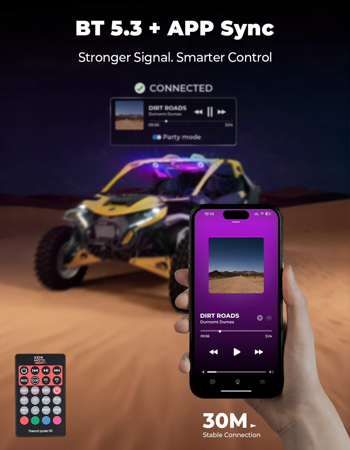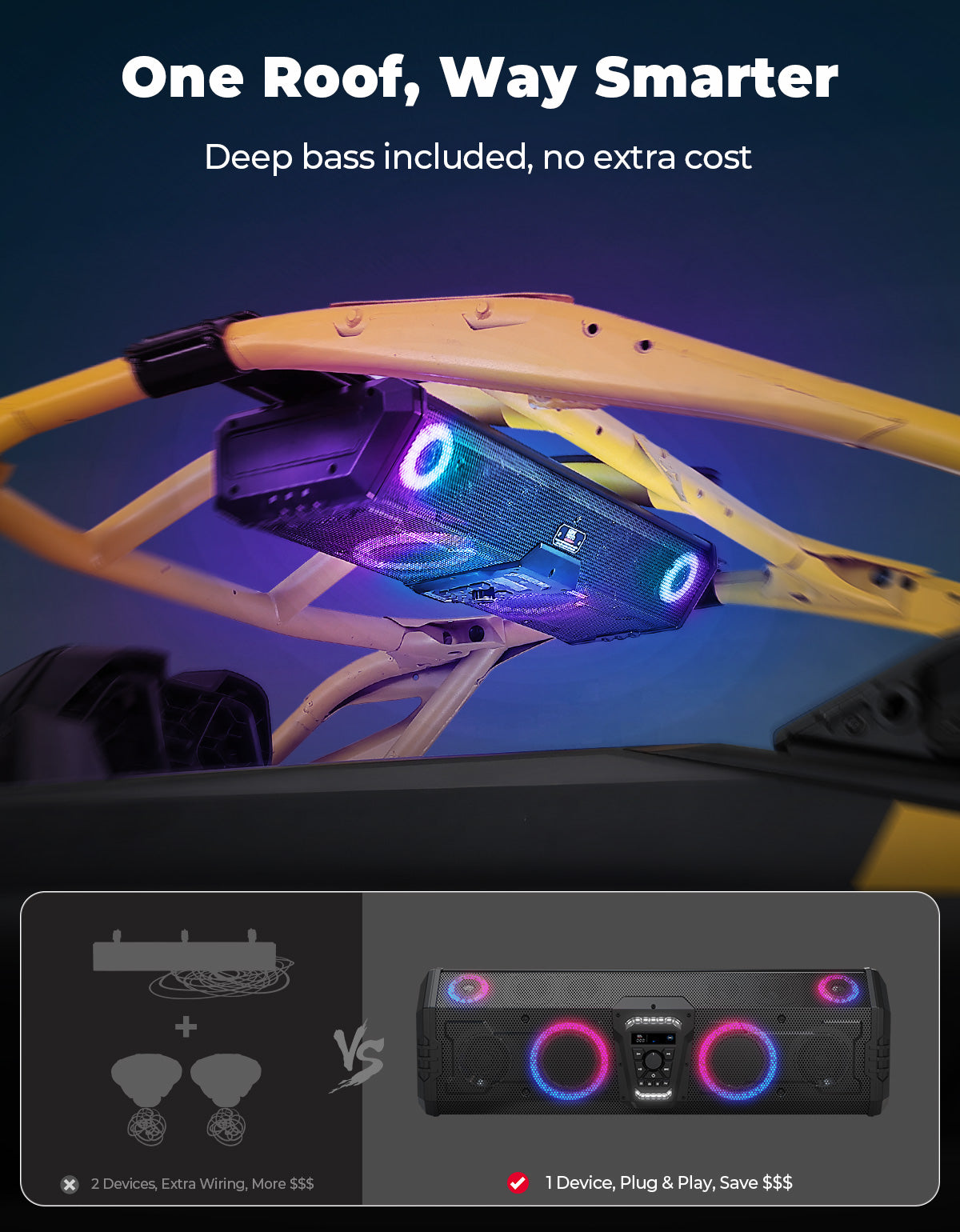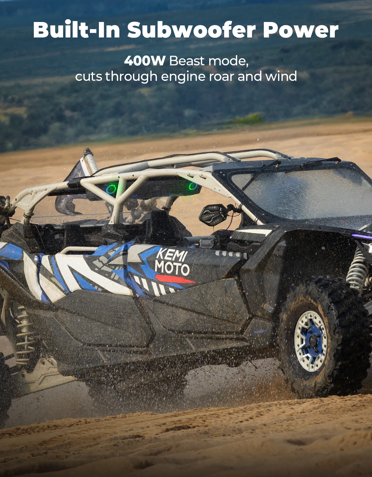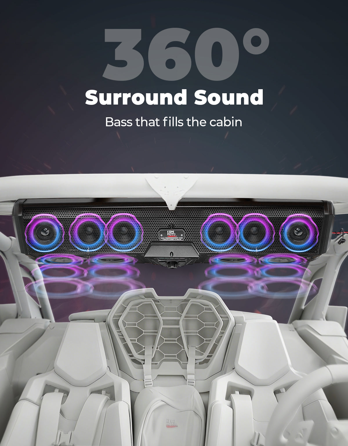 Experience powerful off-road audio with the KEMIMOTO 10-Speaker UTV Sound System. Delivering 400W peak power and up to 112dB max volume, this Bluetooth 5.3 sound bar provides rich, deep bass and crystal-clear highs that cut through engine noise. Built with an IP66-rated aluminum alloy housing, it offers military-grade durability and marine-grade waterproof protection, ready for any weather or terrain. Customize your ride with 200+ RGB lighting modes that sync with your music or switch to a bright white dome light for visibility at night. Compatible with most UTVs including Can-Am Maverick X3, Maverick R, and Polaris XP, this UTV sound system installs easily with or without a roof. Complete with an extension harness kit and waterproof control panel, it ensures seamless control on or off the grid—perfect for riders who demand performance, style, and reliability.