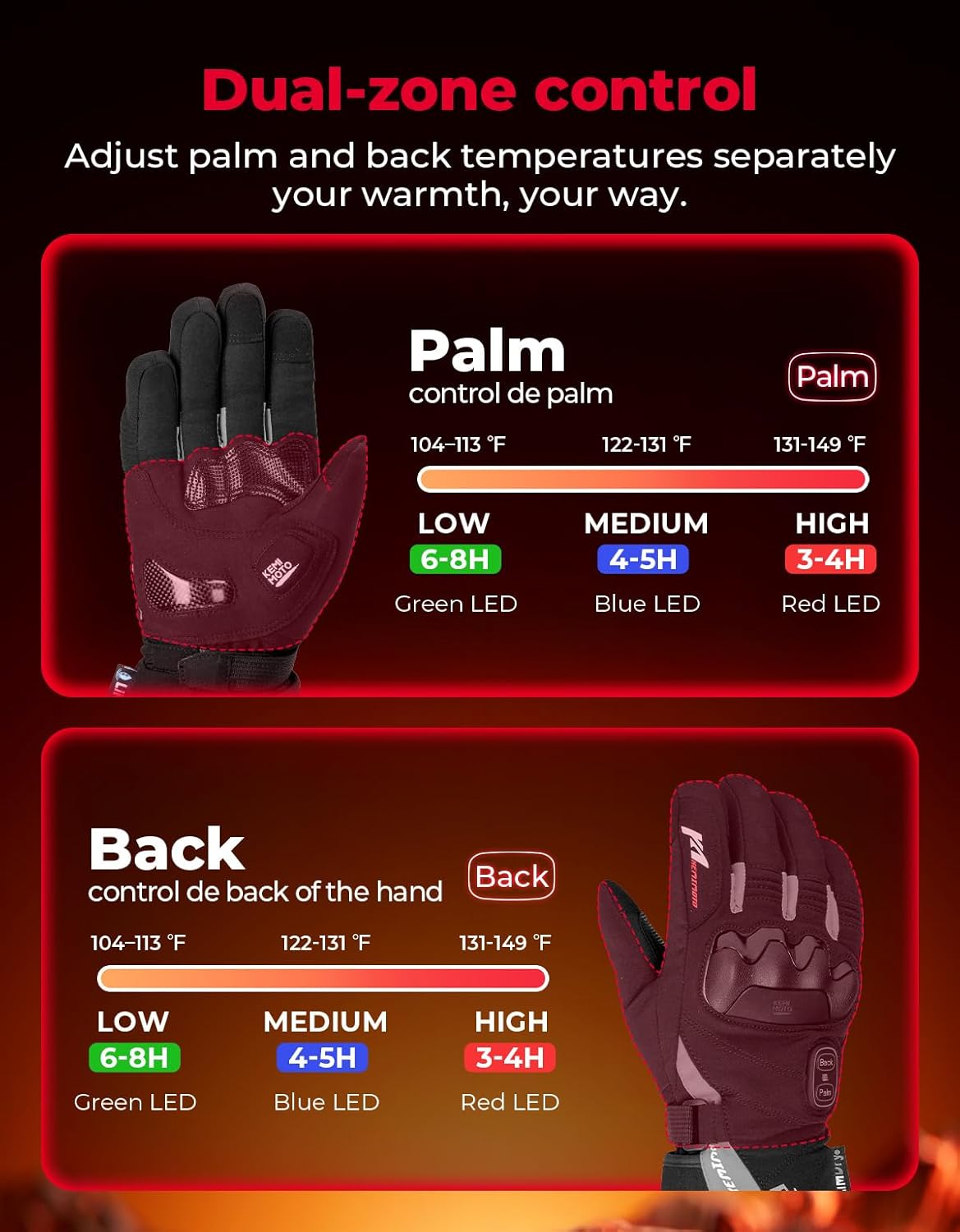 Keep your hands toasty and safe this winter with our heated motorcycle gloves! These gloves come with two strong rechargeable batteries that keep you warm for hours. You can easily switch between three heat levels to find the perfect warmth. Need to use your phone? No problem¡ªthese gloves work with touchscreens! They also have top-notch waterproof and windproof features, your hands stay dry in any weather. Built tough with carbon fiber protection and sturdy leather palms, they're great for all sorts of winter fun like skiing, riding, or shoveling snow. Don't miss out¡ªgrab a pair now and enjoy the warmth!