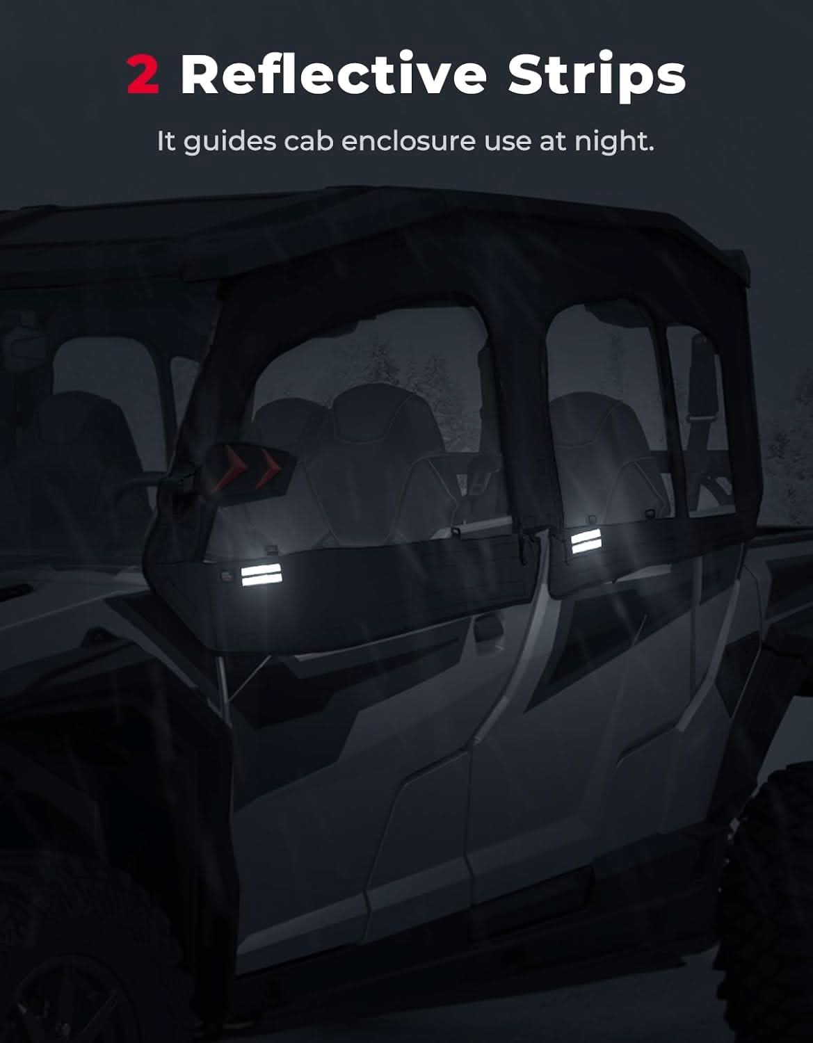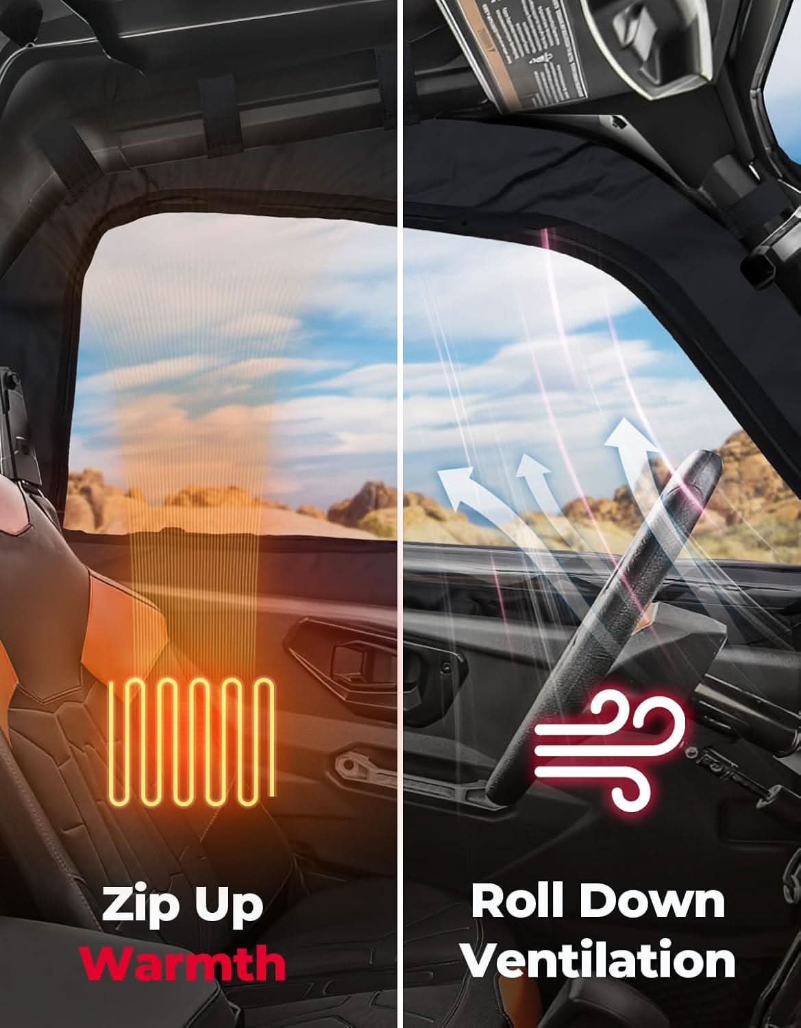 UTV soft cab enclosure for Polaris General 4 1000 (2018-2025) and XP 4 1000 (2020-2026); 98% sealing keeps cabins warmer, YKK zippers, mirror-ready fit, roll-up vents, no-tools install.