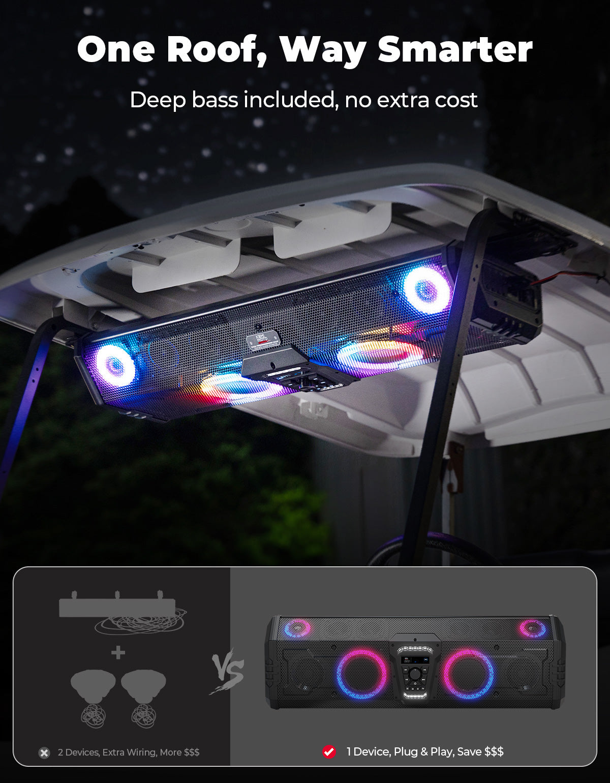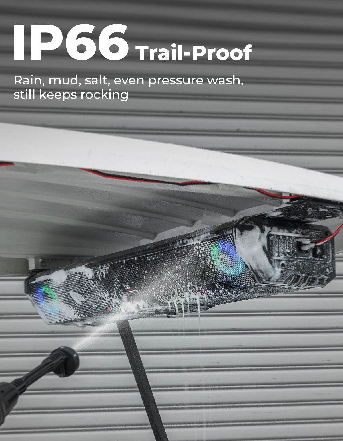 Experience powerful off-road audio with the KEMIMOTO 10-Speaker UTV Sound System. Delivering 400W peak power and up to 112dB max volume, this Bluetooth 5.3 sound bar provides rich, deep bass and crystal-clear highs that cut through engine noise. Built with an IP66-rated aluminum alloy housing, it offers military-grade durability and marine-grade waterproof protection, ready for any weather or terrain. Customize your ride with 200+ RGB lighting modes that sync with your music or switch to a bright white dome light for visibility at night. Compatible with most UTVs including Can-Am Maverick X3, Maverick R, and Polaris XP, this UTV sound system installs easily with or without a roof. Complete with an extension harness kit and waterproof control panel, it ensures seamless control on or off the grid—perfect for riders who demand performance, style, and reliability.