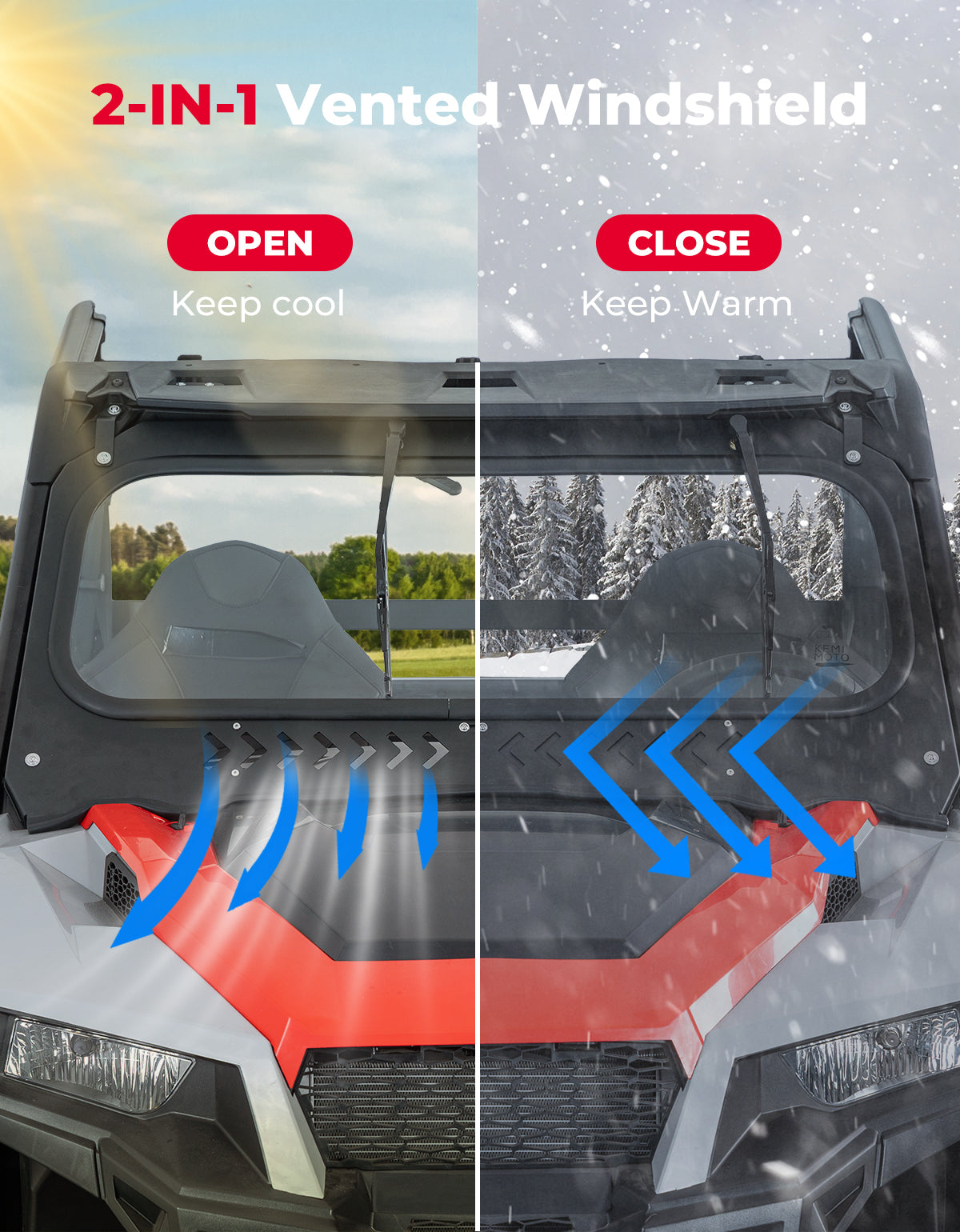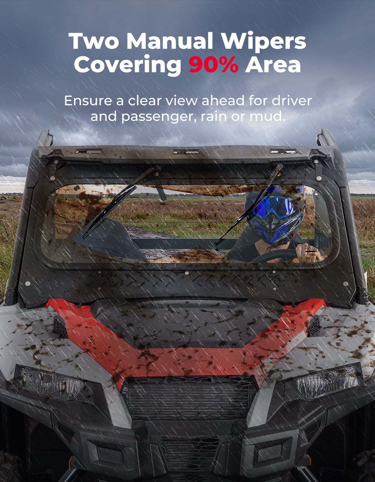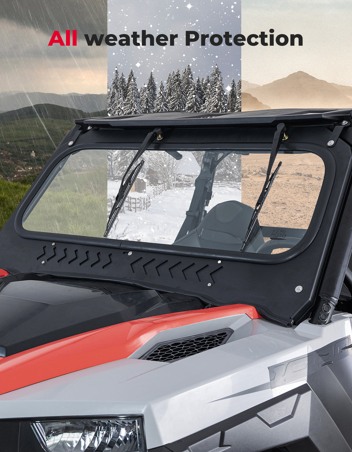 KEMIMOTO glass windshield for Polaris General 1000/XP features dual wipers for 90% coverage, scratch-resistant safety glass, aluminum frame, and a built-in vent. Offers all-weather protection with quick, easy installation for a safer ride.